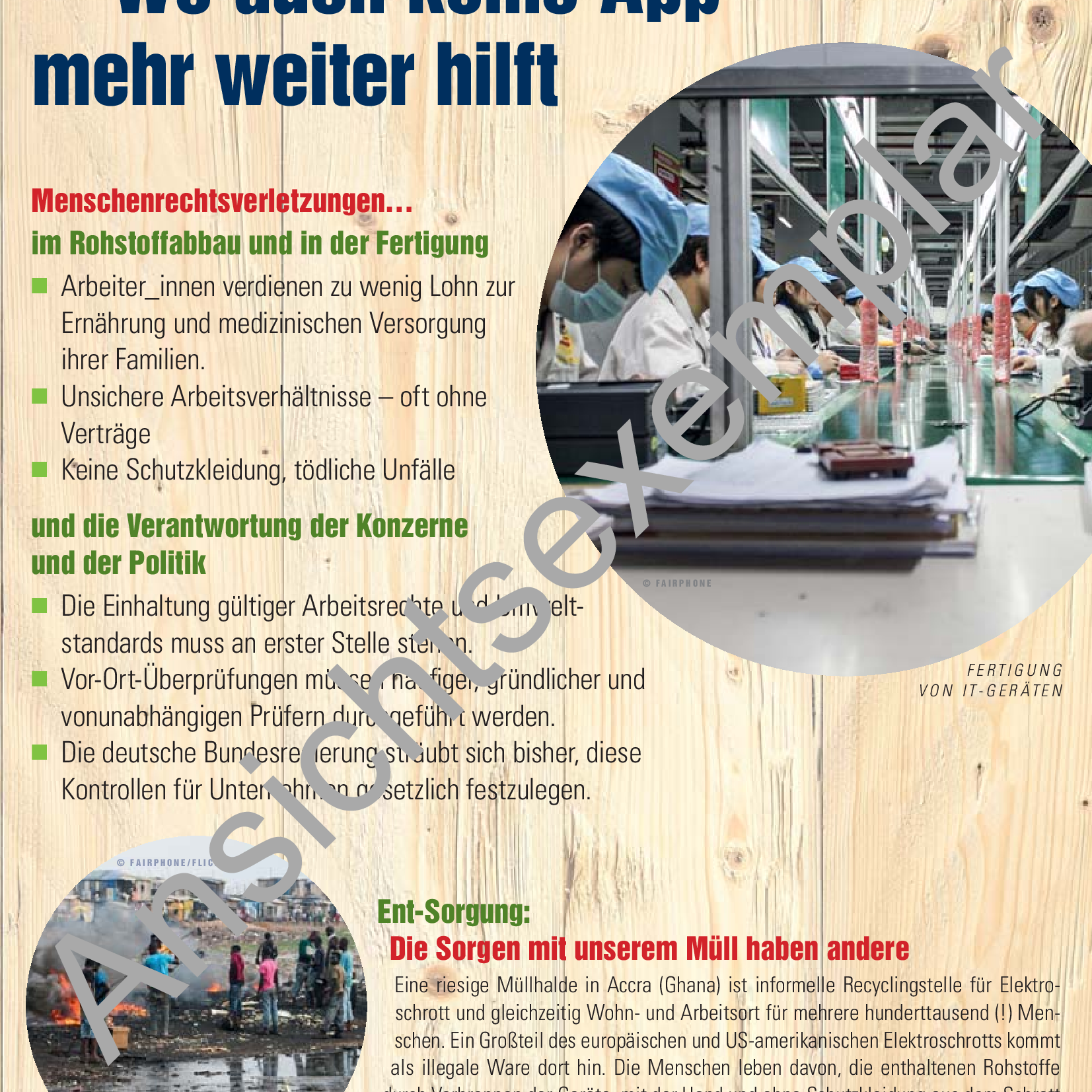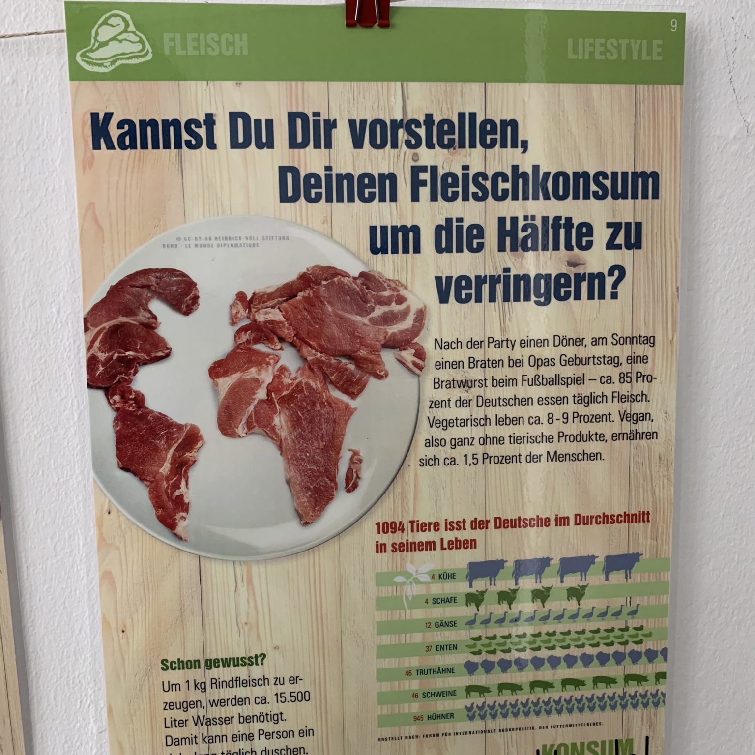 Aufgeteilt ist die Ausstellung in drei Themenbereiche: Fleisch (Klimawandel und Regenwald, ökologische Landwirtschaft), Wachstum (Earth Overshoot Day, Lebenszufriedenheit) und Elektronik bzw. IT (Menschenrechtsverletzungen im Rohstoffabbau und in der Fertigung u.a.).  Mit anschaulichen Grafiken und Texten werden den Besucher:innen die verschiedenen Schwerpunkte nähergebracht.